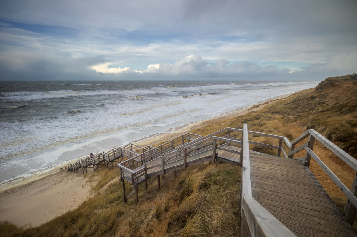 Du gute Güte! Mein Wetterradar zeigt eben noch zu erwartende kurze Aufheiterungen, da kommt genau das Gegenteil auf mich zu. Als ich in Kampen den Kliffkieker mache, segeln die mächtigen Schauer noch links und rechts an mir vorbei…:
