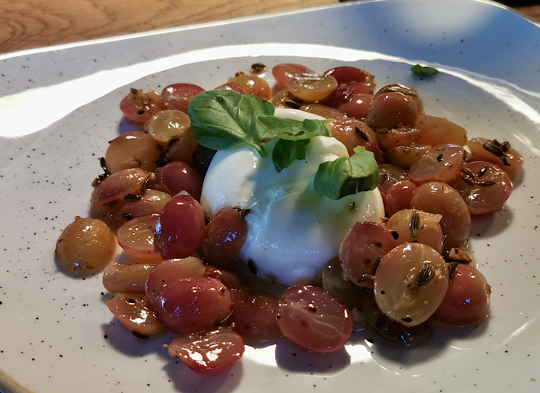 Und natürlich wird auch wie immer – bei allerliebsten Freunden und Bloglesern der ersten Stunde – gemeinsam gekocht. Und zwar vorweg eine Burrata mit selbstmarinierten und angebratenen Weintrauben mit Fenchelsamen…: