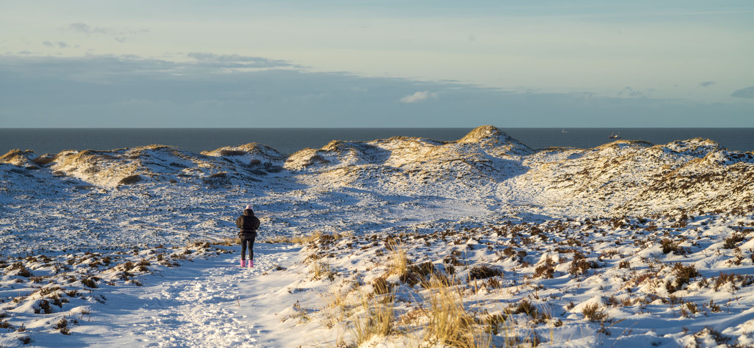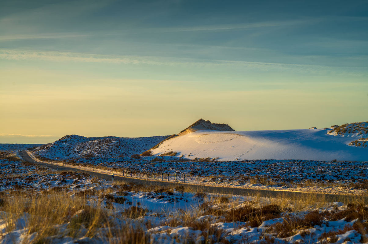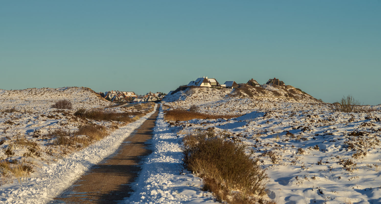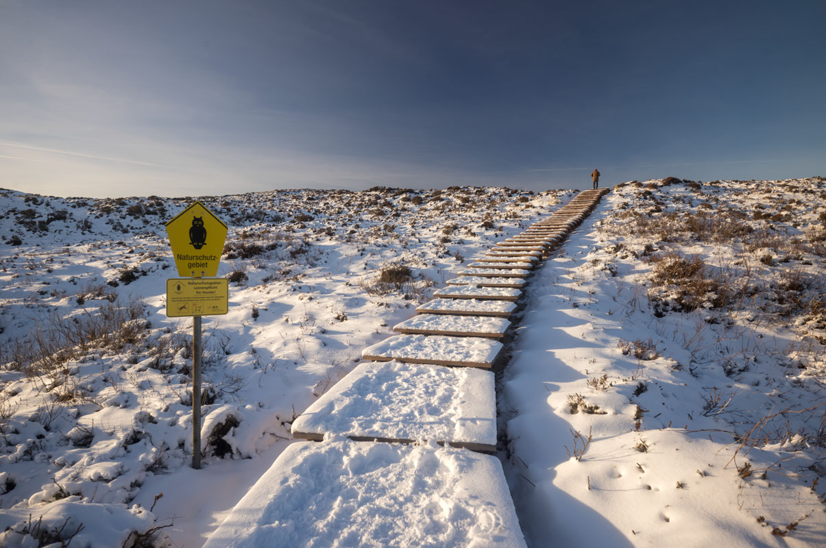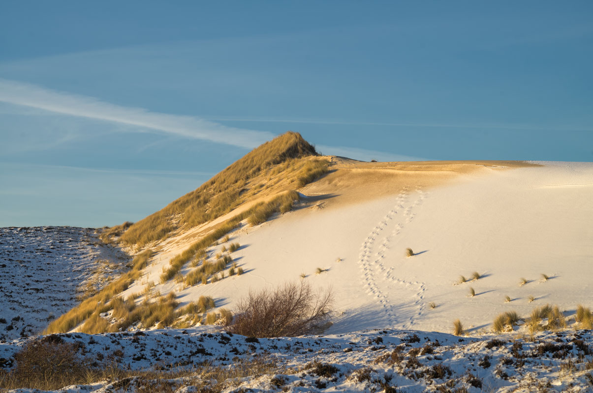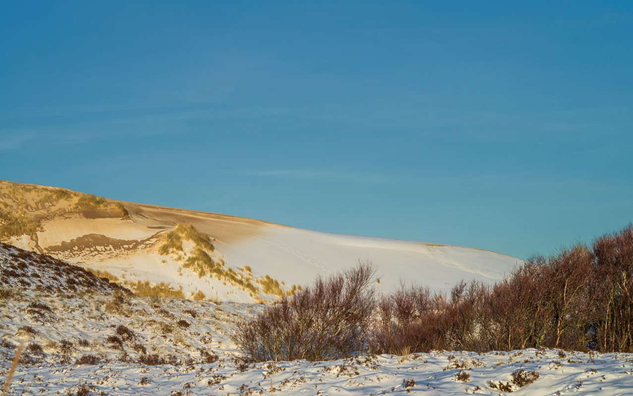 … wobei es mir aber um die „Kleine Wanderdüne“ geht, wo es etwas Schönes zu sehen gibt: Der stürmische Wind (ungewöhnlicherweise aus dem Osten) hat nämlich neuen Sand über den Schneeüberzug geblasen, was schon einigermaßen verwegen aussieht: