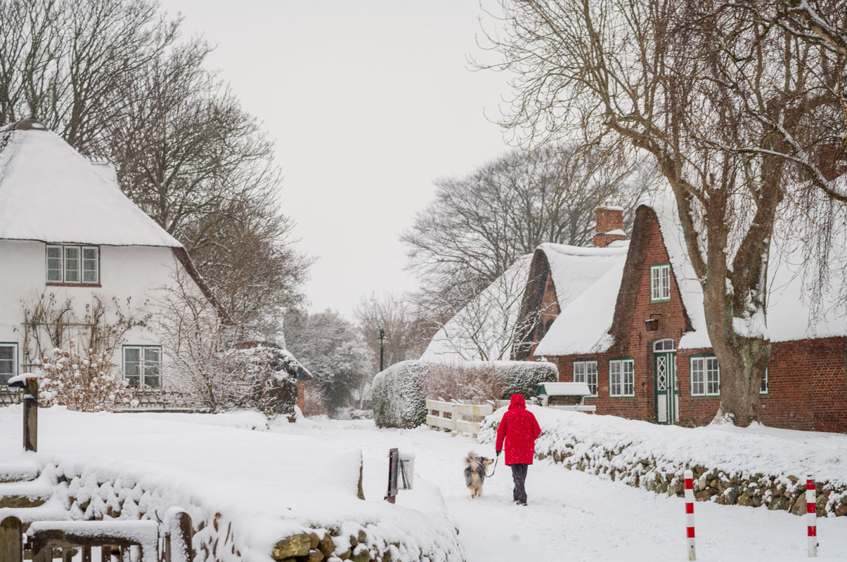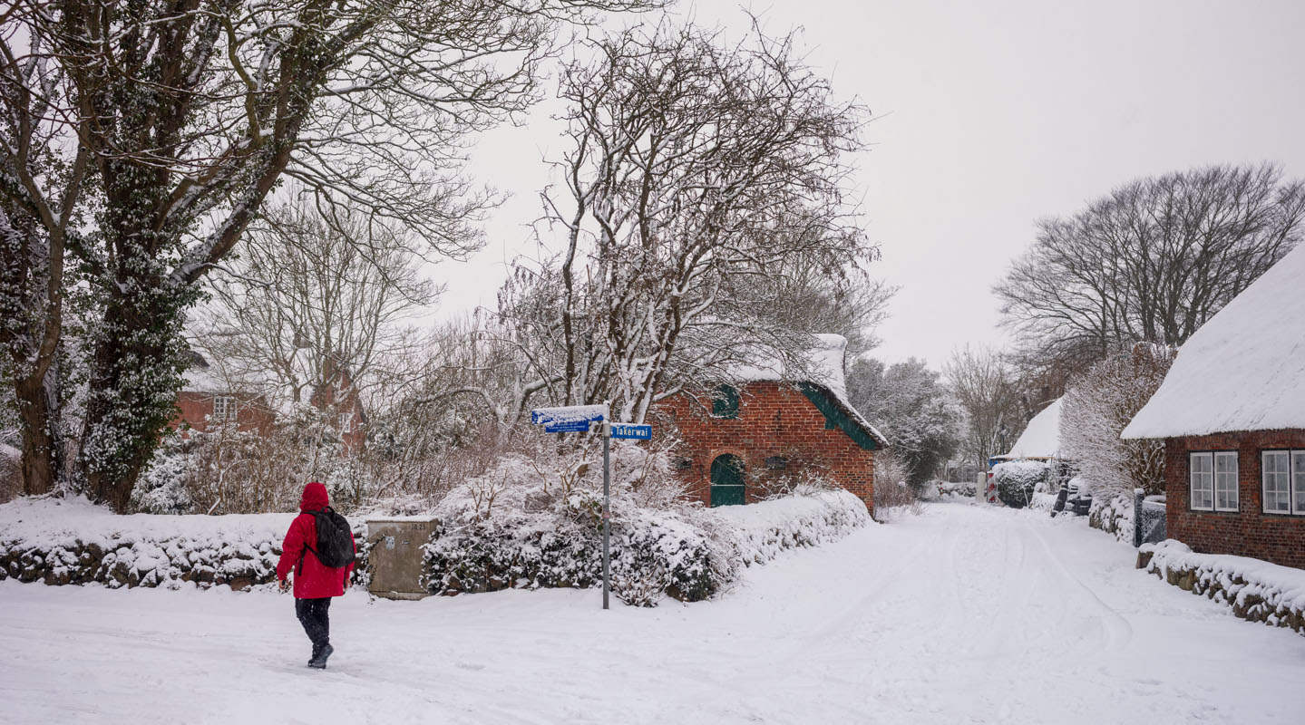 Über Nacht ist die Insel wieder weiß geworden. Mindestens 5 Zentimeter sind bereits bis zum heutigen Morgen gefallen, und die gleiche Menge kommt im Laufe des Tages nochmal hinzu. Vormittags laufe ich durch ein wahres Schneegestöber am Wattufer vor Keitum: