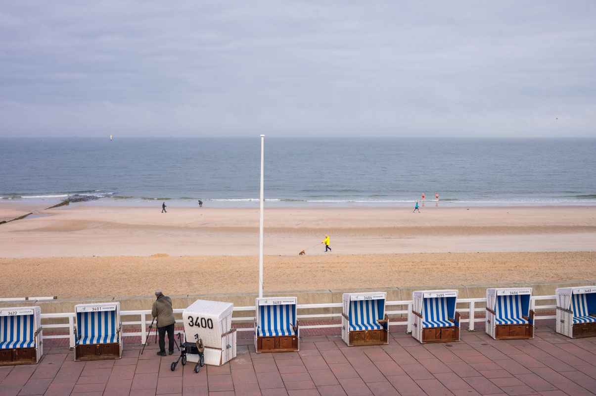 Am breiten Ebbestrand zeigen sich die üblichen Verdächtigen: Von links nach rechts betrachtet der „ganz normale Strandspaziergänger“, dann der „aus ungünstiger Position fotografierende Handyknipser“. In der Bildmitte die „Frau mit dem unerzogenen Hund“, die sich von ihrem Liebling im Zickzackkurs über den Strand zerren lässt.