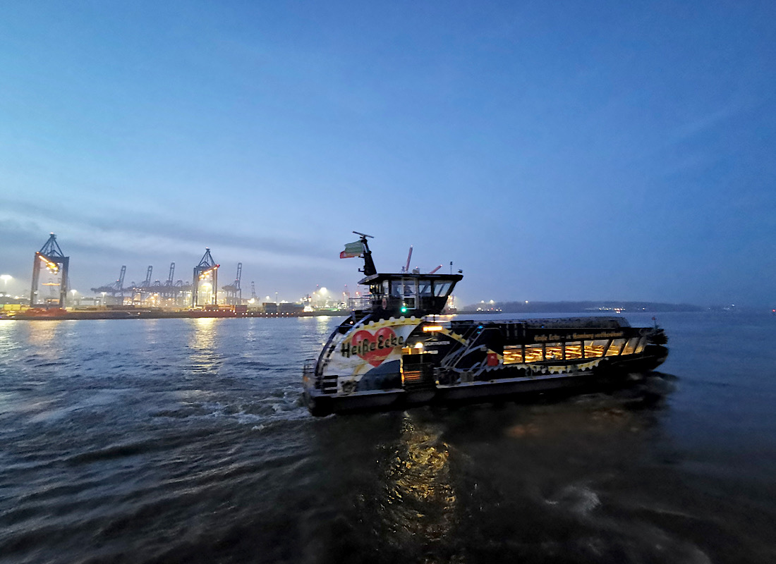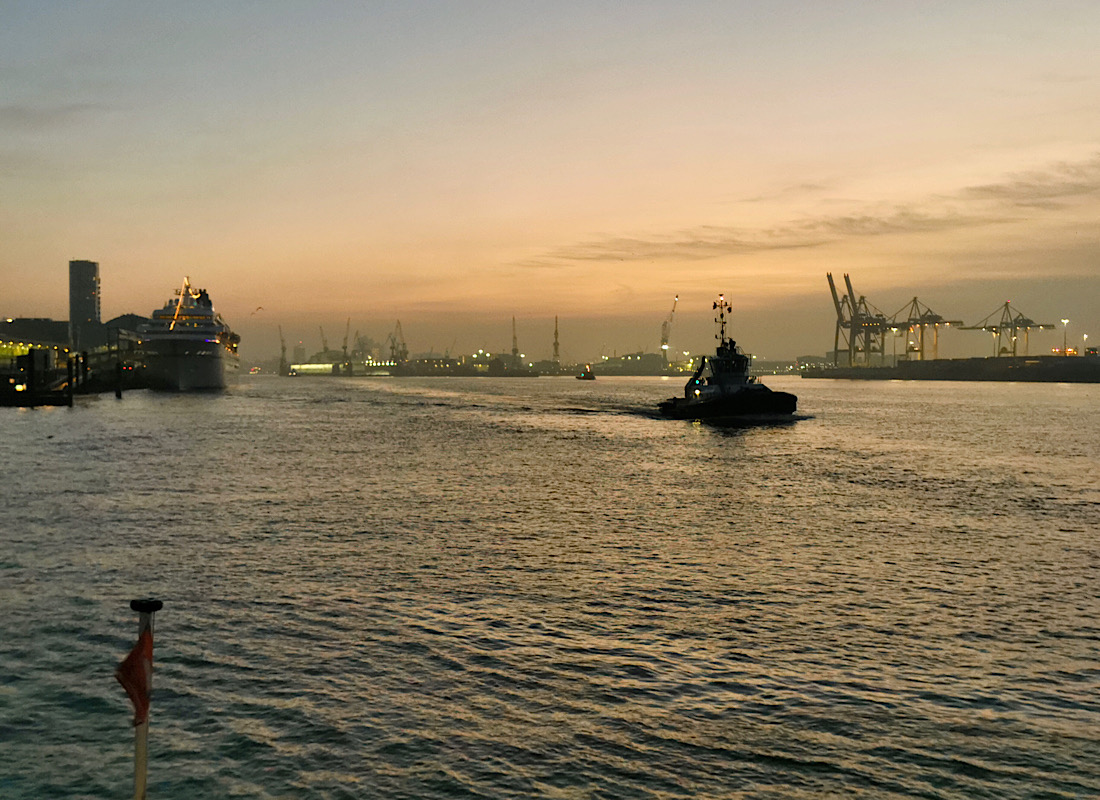 Heute morgen in der ersten Dämmerung bin ich der erste und einzigste Passagier auf der Hadag-Fähre, die mich am Museumshafen Övelgönne..: