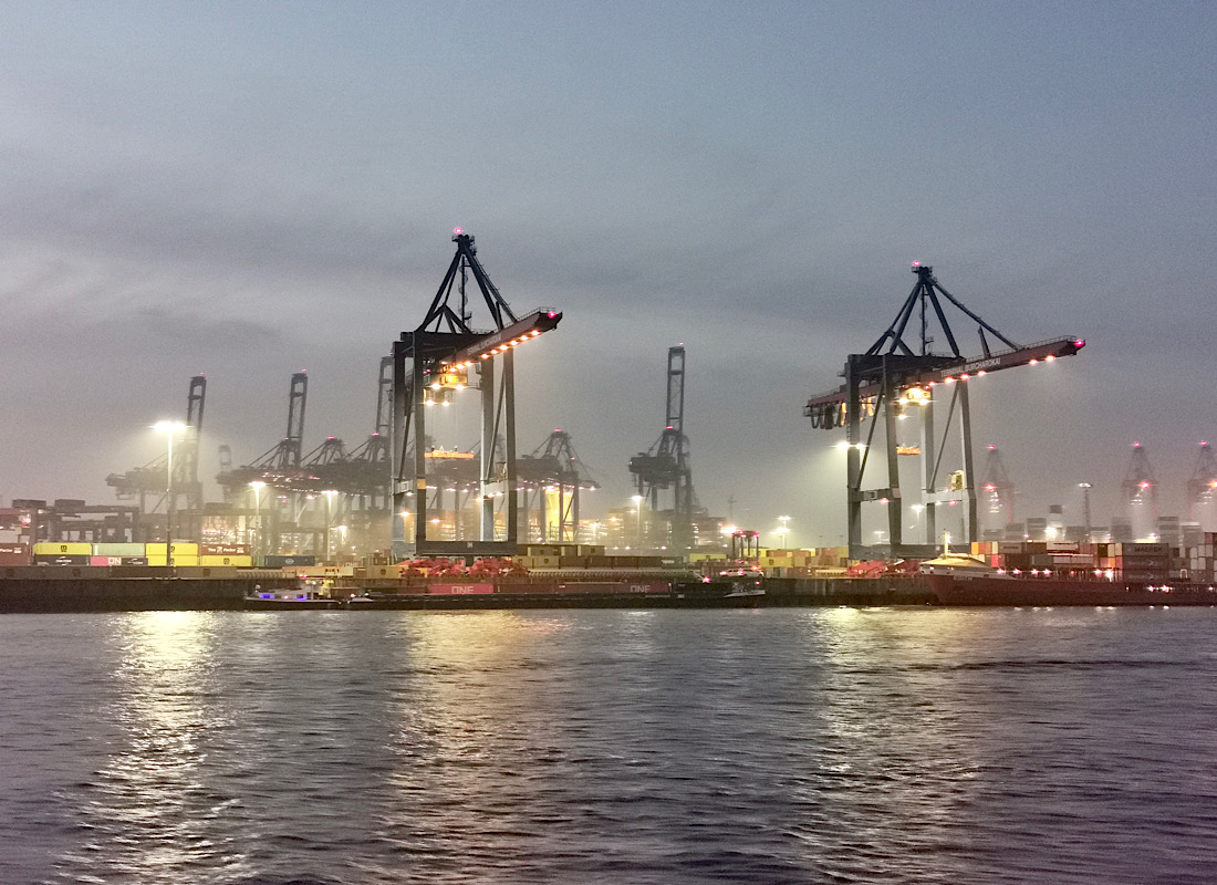 Verblüffend bleibt, daß diese – optisch und mental gesehen – nicht gerade als Vorzeigesituation daherkommende Stimmung in direkter Nachbarschaft zur Krach-intensiven Lightshow im nahen Containerterminal keinerlei Depri-Emissionen zu mir rübersendet, haha. Die „Bright Lights“ und das hörbar geschäftige Treiben aus dieser „anderen Welt“, die sich 24/7 im Großeinsatz wähnt, stärkt mich ganz im Gegenteil in der Überzeugung, alles richtig gemacht zu haben an diesem Morgen…: