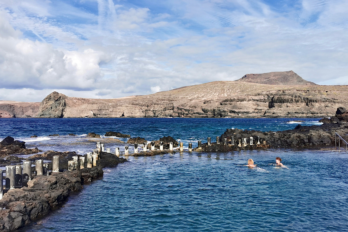 … führt mich direkt zum örtlichen Piscina naturale. Aufgrund des tagsüber kräftigeren Nordost-Passats herrschen heute schräg ablandige Winde, so dass die Dünung recht harmlos ausfällt, und in den insgesamt vier Becken herrscht ordentlich Badebetrieb. Frischestes Meerwasser plus Sicherheit, das sind die Erfolgs-Ingredienzen dieser Naturschwimmbäder: