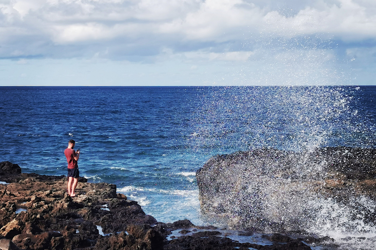 Gleich nebenan gibt’s ein Blowhole, das trotz der nicht eben idealen Bedingungen gleich den nächsten Handyknippser anlockt, haha: