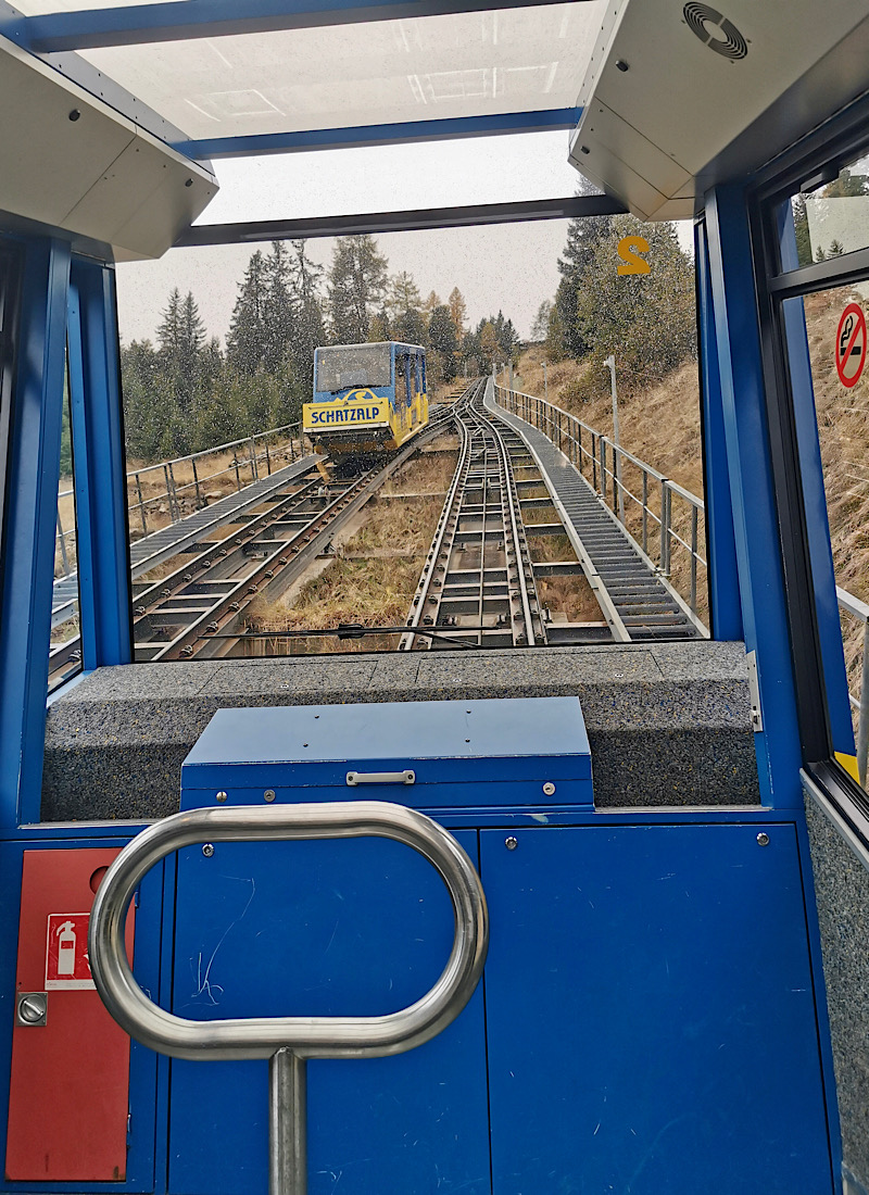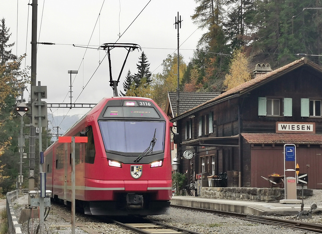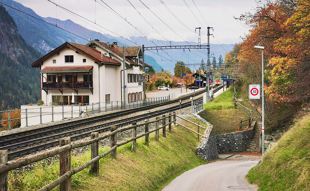 Das ist heute nun anders. Die tagsüber zwischen 6 und 22 Uhr im Stundentakt von CHUR und ST. MORITZ hier durchfahrenden Personenzüge – darunter der berühmte BERNINA- und der noch berühmtere GLACIER-EXPRESS – werden von den Hotelgästen mit offenen Armen bzw. Mündern empfangen und ausgiebigst und fachmännischst begutachtet. Warum? MANU ist ein Schweizer Reiseveranstalter, der Pauschalreisen für Eisenbahn-Enthusiasten zu (für Schweizer Verhältnisse) günstigen Preisen anbietet: Unterkunft mit Halbpension incl. freier Fahrt per Bahn und Postauto (Bus) für die ganze Zeit des Aufenthalts in dem betreffenden Kanton.