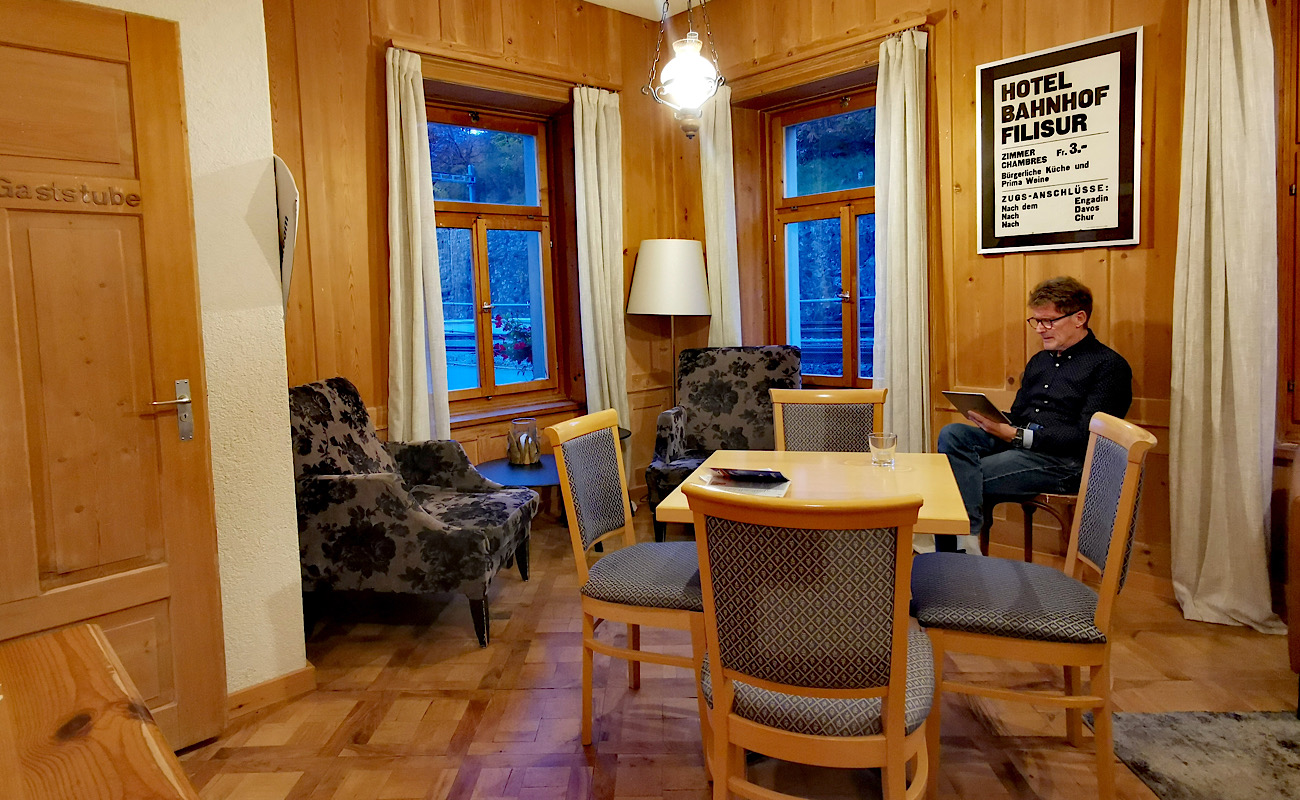 … ‚HOTEL BAHNHOF FILISUR’, richtig. Aber das lief über die Jahrzehnte nicht immer so richtig gut, weil dieser Name doch eine etwas übertriebene Gleisnähe suggerierte, also Krach – um es mal auf gut Deutsch zu sagen. Und das schreckte doch so manchen potentiellen Gast ab.