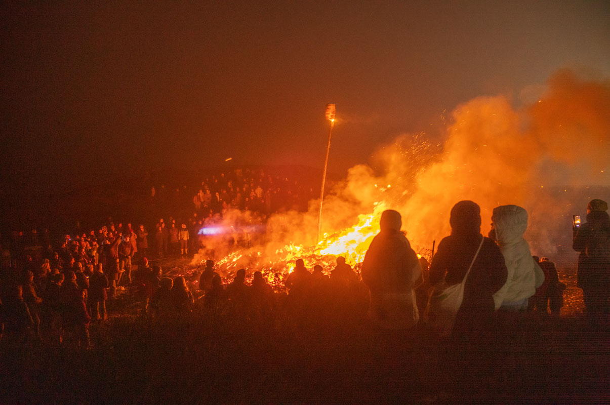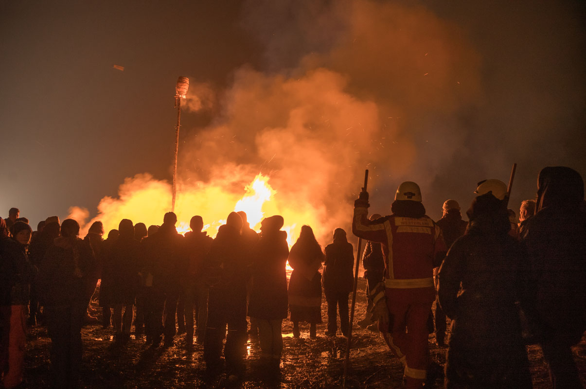 Sie hält sich tapfer bis fast 20:45 Uhr, dann erwischt sie ein Frontaltreffer der wahren Hundertschaft an Schneebällen, die mittlerweile durch die Luft fliegen – schwer und eisenhart vom Tauwetter. Ein Aufschrei der noch gut 150 Ausharrenden, dann knickt sie seitlich ab, begleitet von deren tosendem Applaus. Es ist vollbracht, der Grünkohl ruft: