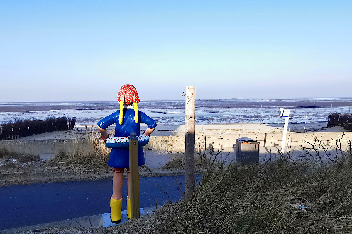 Nun aber „mal Butter bei die Fische“, wie der Küstenbewohner auch in diesem Ort sagt, der eigentlich nur ein Ortsteil einer Stadt ist, aber durchaus eine eigene Geschichte als Seebad aufzuweisen hat. Obwohl sich das Meer in den Tagen unseres Hierseins aufgrund des ruppigen, kalten Ostwinds gar nicht vorm eigentlichen Strand gezeigt hat… So habe ich zur Kenntnis zu nehmen, dass ‚Seeblick‘, haha, nicht zwangsläufig bedeutet, dass das Meer auch zu sehen ist, hihi. Eher nur zu erahnen: