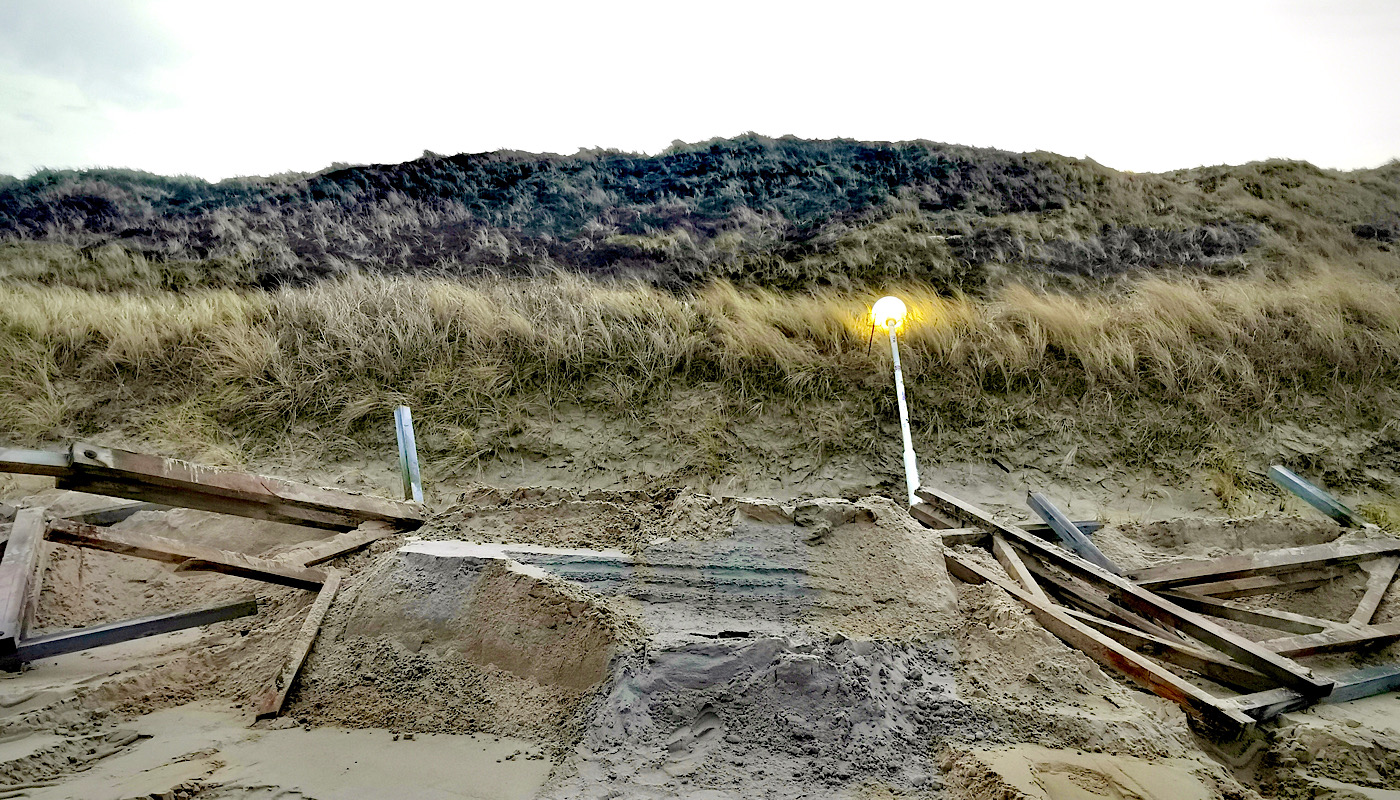 Beim obligaten Frühmorgen-Strandcheck stehe ich vor einer verwüsteten Wandelbahn zwischen Käpt‘n-Christansen-Straße und Himmelsleiter. Hat hier die Sylter Brutalo-Natur erneut gnadenlos zugeschlagen?