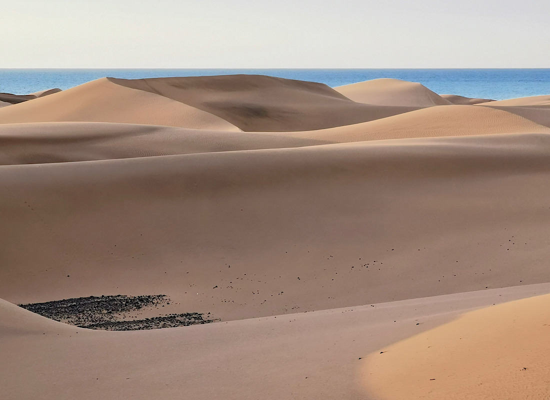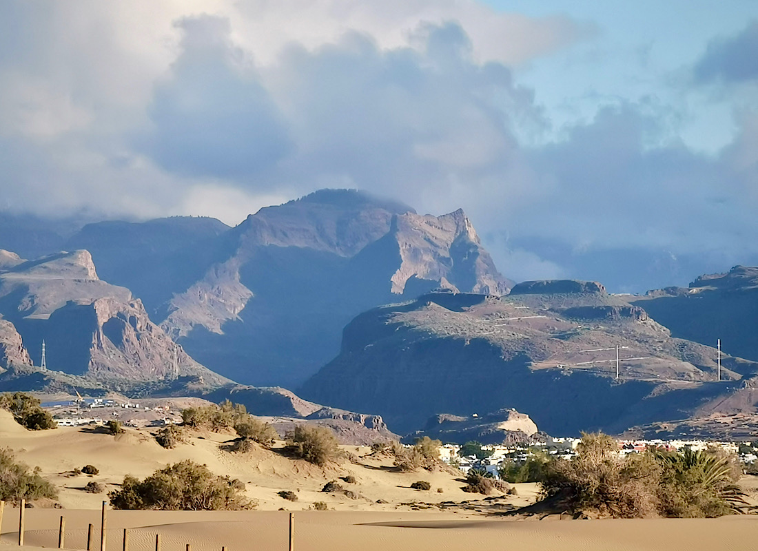 Mich als Geograf interessiert natürlich, warum diese Dünen – in dieser reinen Form in Europa einmalig! – genau hier entstanden sind. Ich mach‘s auch kurz: Der Sandlieferant – wichtigster Faktor der Dünenentstehung – liegt gleich nebenan, die Sahara. Und der Sand weht nur bei Ostwind heran und findet ideale Bedingungen, sich auf ganzer Breite zwischen den Pflanzen im Schotterbett des Barrancos von Fataga zu fangen, den ich gestern durchwanderte: