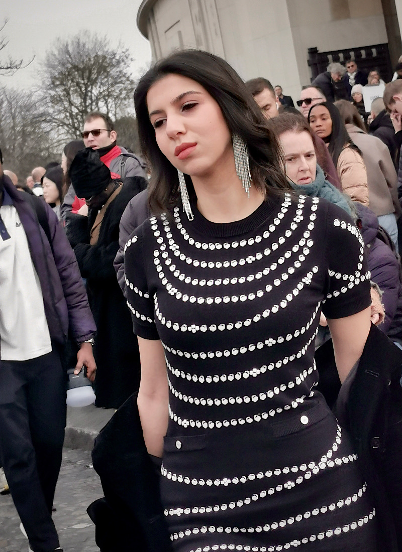 Nicht ganz einfach, dieses Unterfangen, hat doch die Konkurrenz längst diverse Open Air-Fotostudios mitten in all dem Gewühl errichtet, inklusive kompletter Blitzanlagen und Akku-Generatoren, Schminktischen samt Spiegeln und Getränken… während auf dem Trocadéro-Kreisel eine schwarze Edellimousine nach der nächsten vorfährt, und sich erste Protagonistinnen der PARISER FASHION WEEK (Aha!) mit betont laaangen Beinen und suuuperreizend niedergeschlagenen Augen aus den gepuderten Fahrzeugen schääälen. Erste Exemplare dieser Gattung Weib führen bereits mitten auf der Straße waghalsive Catwalk-Manöver vor. Und sobald eine weitere Autotür zaghaft von innen geöffnet wird, stehen smarte Butler und prallkörpriges Sicherheitspersonal in Sekundenschnelle vor diesen armen, durchweg hungrig aussehenden Schönheiten, die sich in kaltem Wind, mehr oder weniger schwachbekleidet, den begehrlichen Blicken und Rufen dieser Meute fotografischer Fleischbeschauer ausgesetzt sehen.