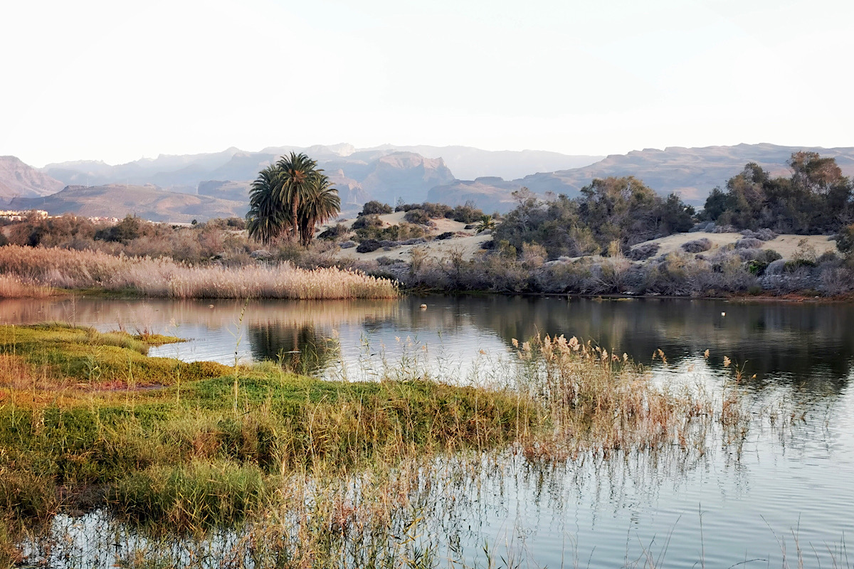 Als ich morgens zum Baden gehe, sehe ich die bis 1800 Meter hohen Gipfel Gran Canarias erstmals komplett ohne Wolken:
