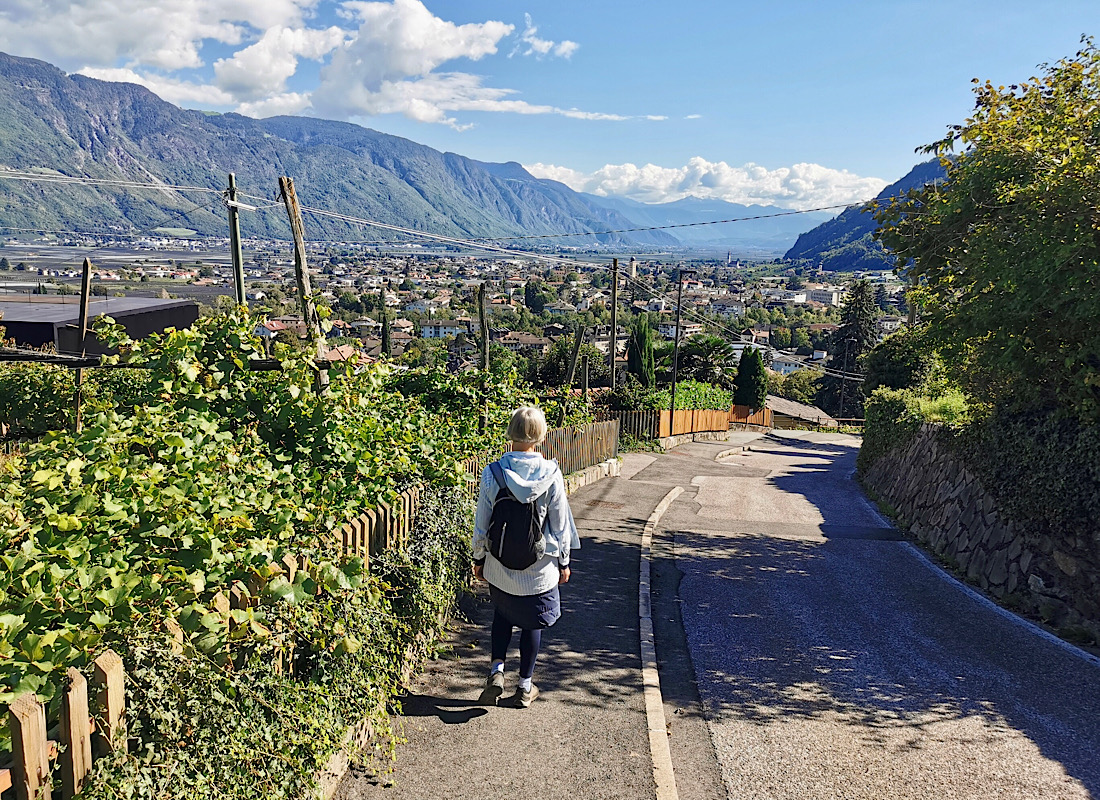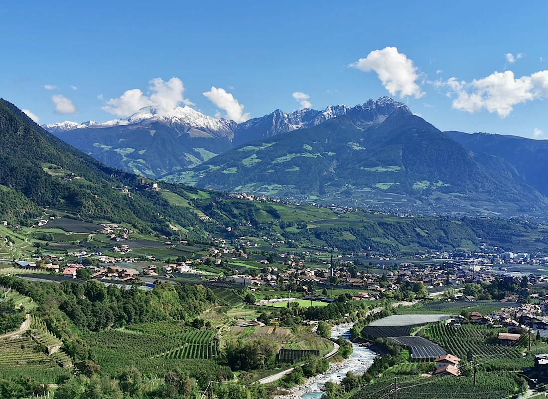 … über insgesamt zwölf Kilometer bis nach LANA bringen soll. Gleich nach dem Start bekommen wir einen grandiosen Blick über das Etschtal geboten – der schneebedeckte Berg hinten links ist der fast 2.00 Meter hohe Hirzer in den Sarntaler Alpen: