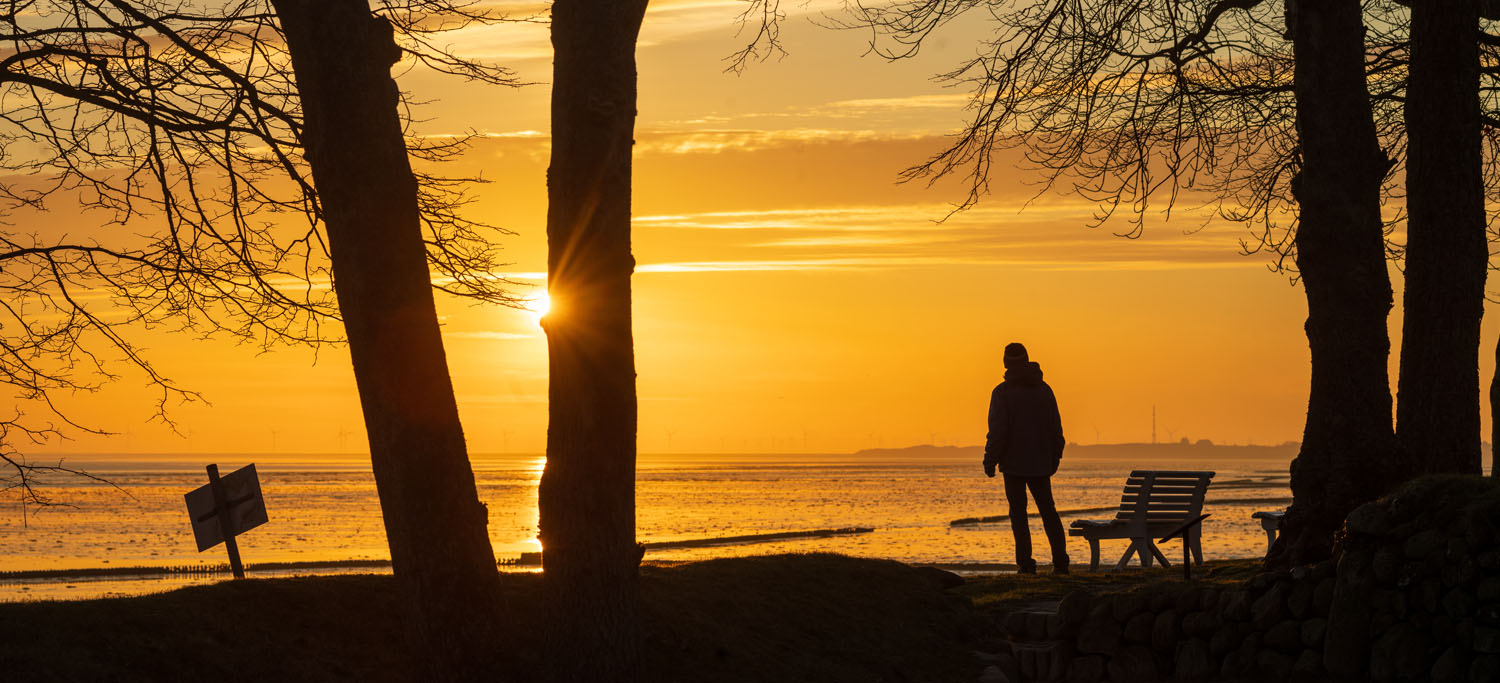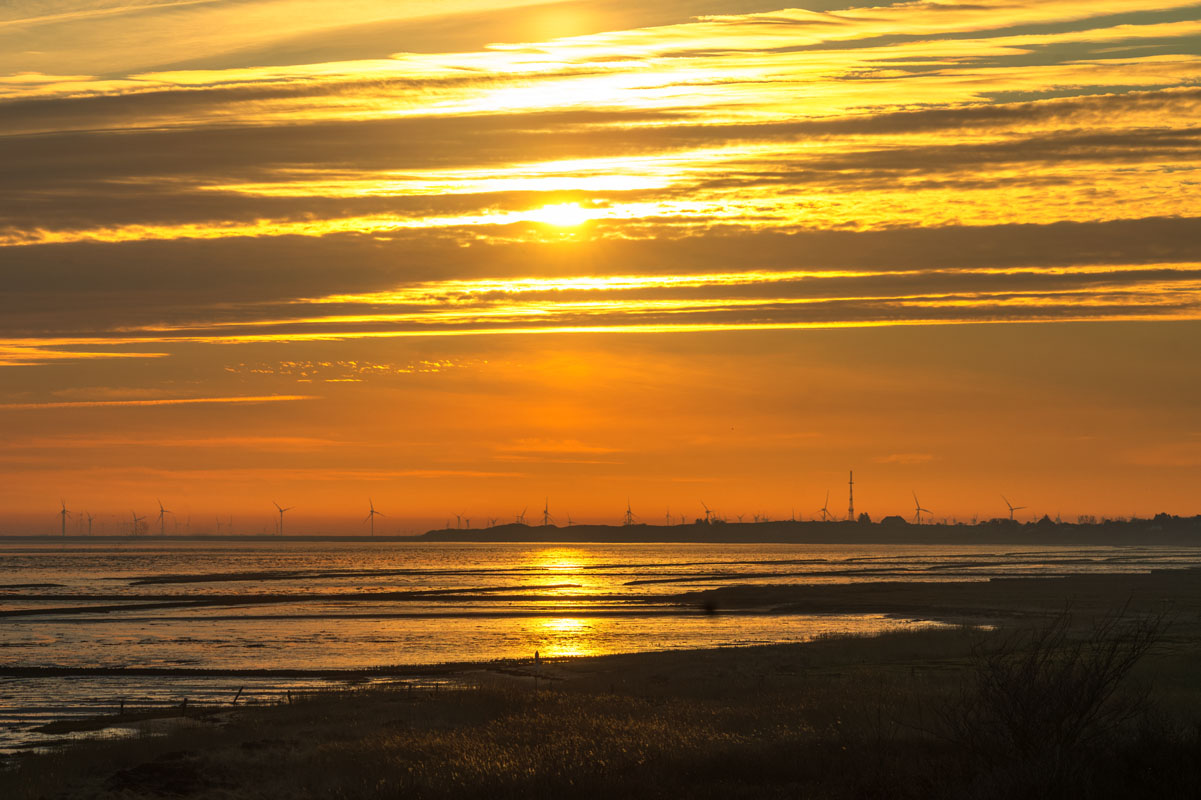 Zum Sonnenaufgang bin ich zwischen Munkmarsch und Keitum unterwegs, von wo aus die Windräder-Ensembles auf dem nahen Festland besonders beim morgendlichen Gegenlicht ins Auge springen: