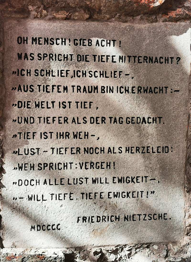 Auch Nietzsche war häufig hier, deshalb gibt’s einen passenden Gedenkstein mit Gedanken, die ihn hier im Jahr 1900 beim Wandern „übermannten“: